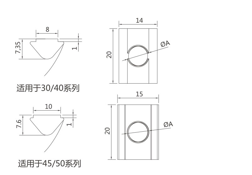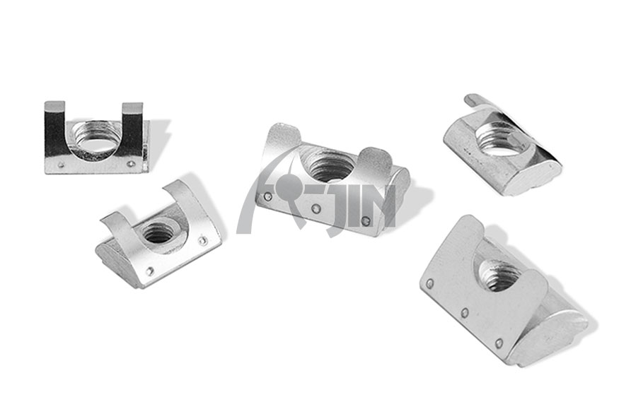 彈片螺母塊能被直接塞進鋁型材槽坑中的任意裝配點,他背部的彈片能撐起并固定它的位置,使安裝十分簡單且可靠,它是型材連接中使用較多的配件之一。