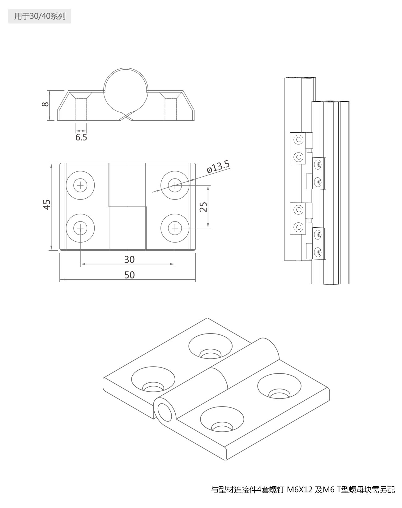 用于連接型材與型材或板之間的活動(dòng)連接。連接后可脫卸,連接螺釘及螺母塊需另配。
